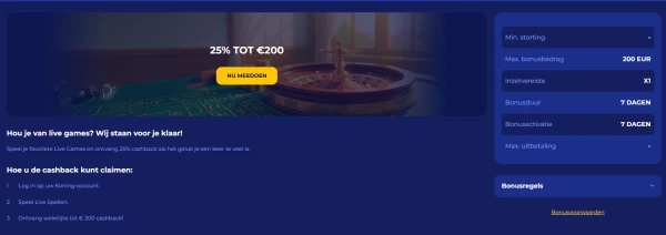 Na je eerste storting kun je reload-aanbiedingen en doorlopende beloningen blijven gebruiken. KoningCasino vaste promoties omvatten een Wekelijkse Reload met 50 Free Spins elke week van maandag tot en met donderdag, plus een Weekend Reload die een 50% matchbonus tot €700 geeft met 50 Free Spins. We bieden ook Dagelijkse Cashback die 5% tot 20% van het nettoverlies teruggeeft, op basis van je VIP-niveau.