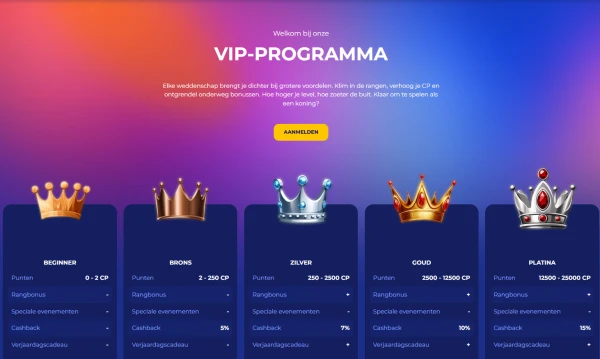 Ons loyaliteitsprogramma start automatisch wanneer je je registreert bij Koning Casino. Je verdient 1 Complimentary Point (CP) voor elke €10 die je inzet, en CP’s helpen je door de levels te stijgen. Naarmate je vordert, kun je beloningen met hogere waarde en betere cashbackpercentages vrijspelen. Hogere niveaus vormen ons VIP-programma, waar voordelen persoonlijker en flexibeler worden.