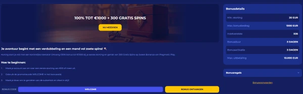 Koning de belangrijkste casino-welkomstdeal is een bonus op de eerste storting: 100% match tot 1000 EUR plus 300 Free Spins. De minimale storting om deze aanbieding te activeren is 20 EUR. De inzetvereiste is 35x (Storting + Bonus). Free Spins worden toegewezen aan in aanmerking komende slots die in jouw bonusgedeelte worden weergegeven wanneer je de aanbieding activeert.