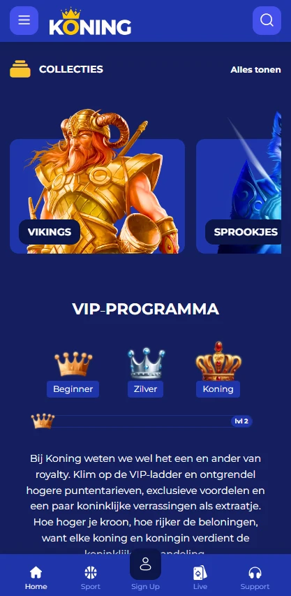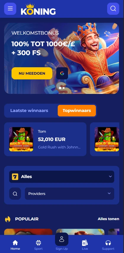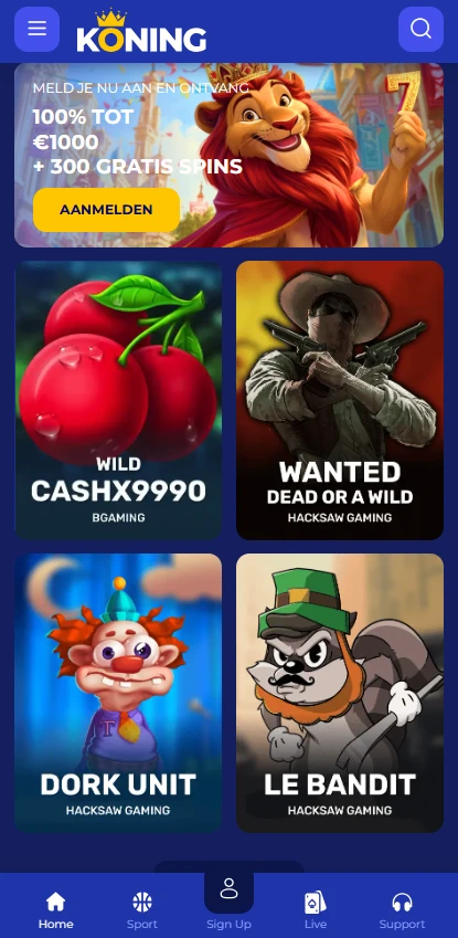 Onze mobiele lobby is gebouwd om de belangrijkste onderdelen dichtbij te houden: Games, Promoties, Sport en de Cashier. KoningCasino biedt een catalogus van ongeveer 5.000 titels binnen Slots, Live Casino, Tafelspellen, Virtual Sports, E-Sports en Sportweddenschappen. Je ziet bekende studio’s in onze lobby, waaronder Pragmatic Play, Evolution Gaming, BGaming, NetEnt, NoLimit City, Yggdrasil, Thunderkick, Hacksaw Gaming, Endorphina en Evoplay.